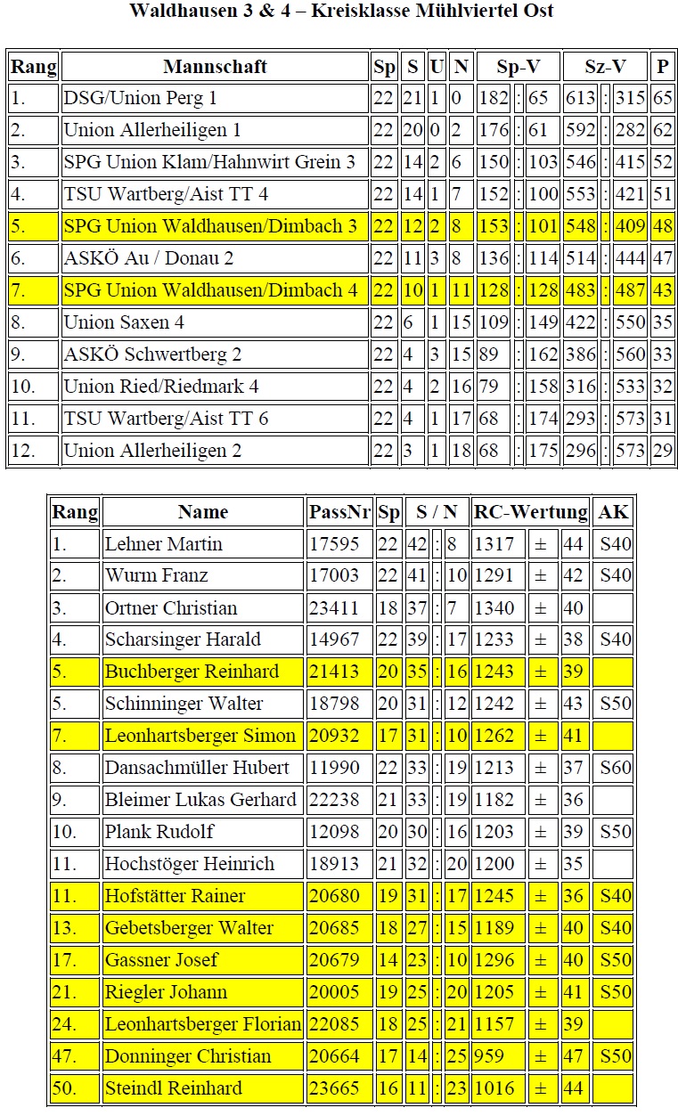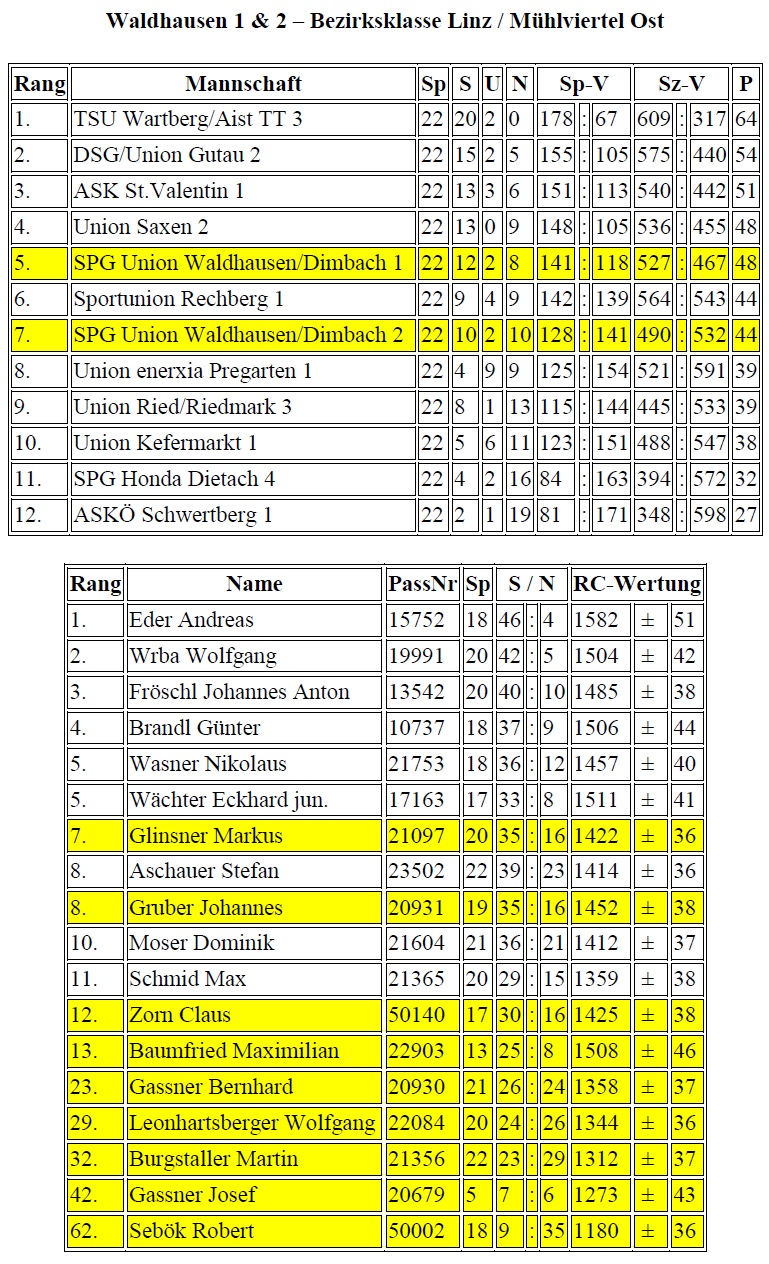 Waldhausen 2 bestand in der abgelaufenen Saison mit Claus Zorn und Johannes „cuTTy“ Gruber aus zwei Regionalliga-erprobten Spielern. cuTTy kam anfangs, wohl bedingt durch den Hochzeitsstress nur langsam in die Gänge. Im Verlauf der Saison ging es dann aber wieder bergauf und so kam er auf Platz 8 in der Einzelrangliste. Claus überzeugte leider nicht restlos und belegt letztendlich Platz 12. Eine tolle Saison gelang Wolfi Leonhartsberger. Nach einer schweren ersten Saison in der Bezirksklasse gelang ihm dieses Jahr eine klare Steigerung und sogar eine (beinahe) ausgeglichene Bilanz. Komplettiert wurde das Quartett durch Dauerbrenner Robi Sebök. Leider tat er sich in der abgelaufenen Saison sehr schwer und landete am Ende der Einzelrangliste.