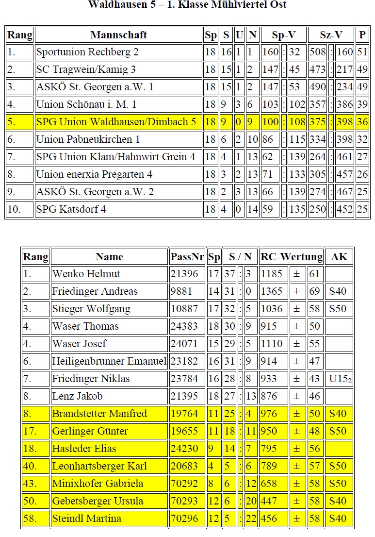Mit dem Gedanken, zwei in etwa gleich starke Mannschaften in der Bezirksklasse an den Start zu schicken, gingen Waldhausen/Dimbach 1 und Waldhausen/Dimbach 2 in die Meisterschaftssaison 2016/17. Letztendlich gelangen Platz 5 bzw. Platz 7 und somit wohl genau jene Ränge, die dank gedachter Konstellation zu erwarten warten.